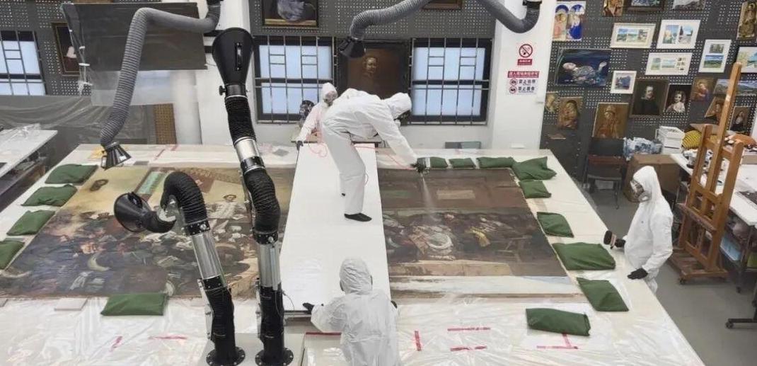 此次修复面临多重挑战,大尺幅操作便是难点之一。该画作尺寸达2.8米×4.8米,翻面、移动时极易受损。团队提前充分讨论操作方案,确保每一步流程安全;针对原木质画框易受潮生虫的问题,改用具备抗潮湿特性的铝合金画框,通过机械力均匀绷直画作,避免人力拽拉不均对画作造成损伤。在修复精度上,为避免损伤颜料层,团队前期开展大量科学检测,深入分析病害原因,依据检测结果制定精准修复方案;修复过程中若遇新问题,立即暂停作业、集体讨论,及时优化解决方案。