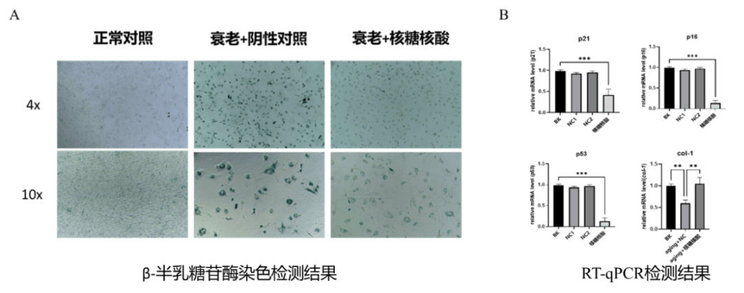 在抗衰领域,抗衰原料miRITA-129已完成细胞和分子实验,结果显示,核糖核酸可显著降低衰老标志物β-半乳糖苷酶及衰老相关基因p16、p21、p53的表达,同时显著上调Ⅰ型胶原蛋白COL-1和弹性蛋白ELN的表达,有效延缓衰老,实现逆龄驻颜效果。