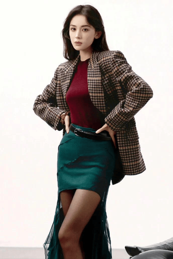 另一套封面造型则展现了娜扎不同的气质。她穿着格纹皮衣,内搭朱红色毛衣,配上墨绿色长裙,呈现出摩登女郎的干练与洒脱。相比温柔甜美的造型,这套造型显得更加潇洒和时髦,气场十足。娜扎在镜头前摆出各种pose,时而坐地,时而叉腰,每一个动作都自带女王范儿。她的镜头感极强,哪怕不是专业模特,也能轻松驾驭杂志大片的要求,完全诠释了时尚与自信的完美结合。
