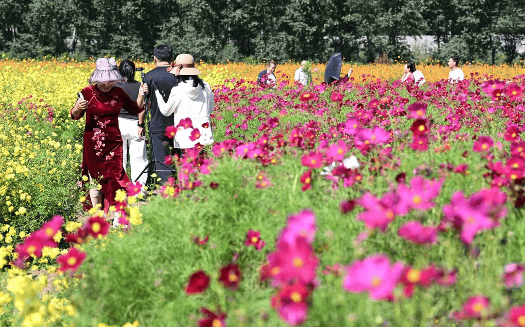 繁花似锦,各展风姿。这片花海于6月下旬开始栽种,如今各类花卉争奇斗艳,绽放出迷人的光彩。向日葵在阳光的照耀下,金黄的花盘如同一个个小太阳,散发着温暖与活力。千日红花期长达3-4个月,能从8月一直美到11月。其花朵小巧玲珑,色彩鲜艳,宛如一颗颗璀璨的宝石镶嵌在花海之中。醉蝶花的花朵犹如翩翩起舞的蝴蝶,轻盈而美丽,为秋日的花海增添了一份灵动与浪漫。百日草有红、橙、黄、紫等多种颜色,层层叠叠的花瓣如同少女的裙摆,娇艳欲滴。硫华菊的花朵灿烂夺目,仿佛燃烧的火焰,给人以热烈而奔放的感觉。波斯菊轻盈飘逸,如同优雅的仙子,在微风中轻轻摇曳。孔雀草的花朵呈橙黄色或黄色,中间有深色的斑点,犹如孔雀开屏般绚丽多彩。