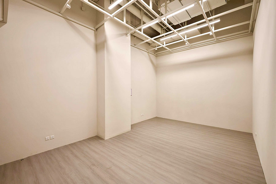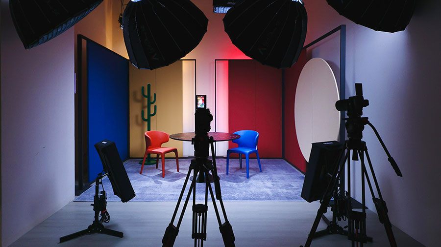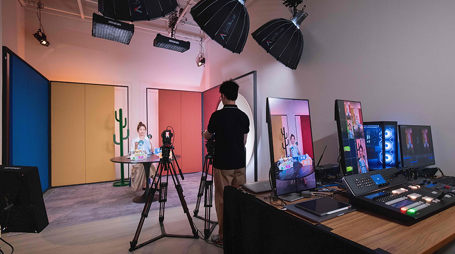 场景设计:选用品牌色系的轻量化材质,采用吊顶方钢提升空间利用率,同步优化声学环境,打造专业影棚质感;